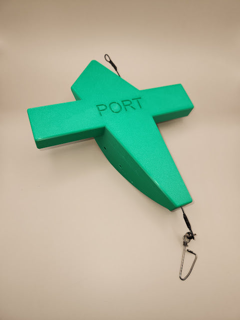A revolutionary addition to any trolling spread. Clipped to the mainline and towed from the rod tip or outriggers. Use in tandem with your favorite single lures, chutes, cedar plugs, daisy chains and rigged baits. Trolled at 5-7kts, our Patent-Pending offset body and weighted keel aggressively tracks off to its designated side, placing lures outside of the boats wake and into clean undisturbed water. Great for small boats lacking outriggers. Center consoles can benefit by fishing 2 extra rods close to the bow. Placing the lures next to the boat and in front of the first wake, our favorite spot for a cedar plug or ballyhoo rig.